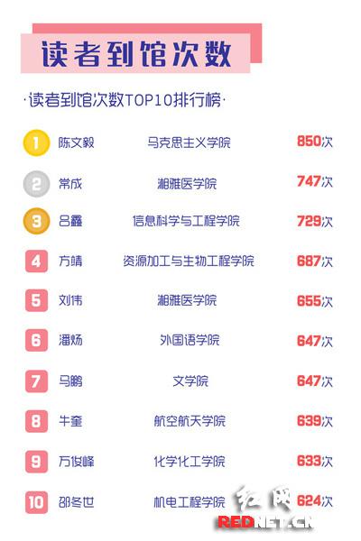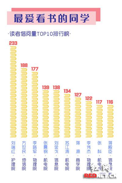 接着便是被网友称为“馆霸”的入馆次数最多和最爱看书同学的榜单,来自马克思主义学院的陈文毅同学以全年850次进入图书馆摘得“馆霸”称号,来自湘雅护理学院的刘瑞红同学以年借书量233册名列读者借阅量榜单之首。