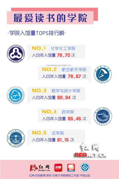 数据还统计了中南大学31个二级学院的入馆排行榜,化学化工学院、航空航天学院、数学与统计学院、药学院和法学院名列全校前五,摘得“最爱读书学院”的称号。