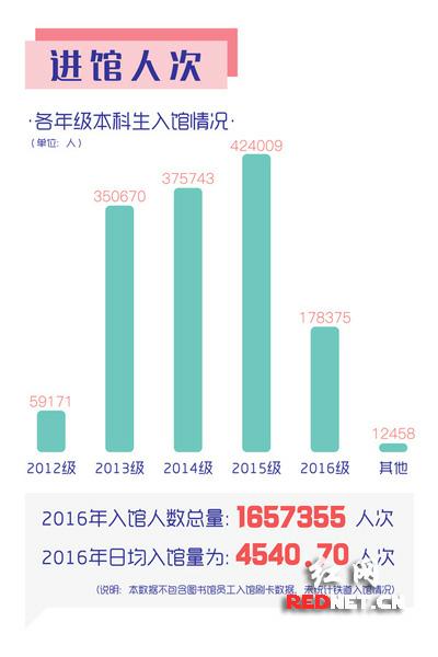 第二类信息统计了图书馆全年入馆人数,2016年共有165万人次进入图书馆,相当于全年每天(仅图书馆 开放日统计)就有4500多位同学进出图书馆,其中2015级的学生进出图书馆次数最多。