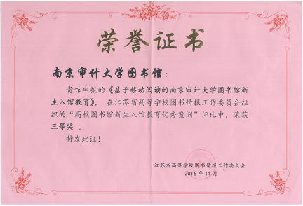 日前,由江苏省高校图工委读者服务与阅读推广专业委员会、江苏省高校图工委队伍建设与职业素养专业委员会联合举办的“江苏省高等学校图书馆读者服务与队伍建设发展论坛”传来喜讯,南京审计大学图书馆信息咨询部陈璐撰写的《基于移动阅读的南京审计大学图书馆新生入馆教育》一文在江苏省高等学校图书情报工作委员会组织的“高校图书馆新生入馆教育优秀案例”评比中荣获三等奖,受到该委员会的表彰。