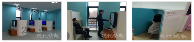 在图书馆四楼,有一个集互动交流,视听娱乐,阅读,冥想,3D打印于一体的区域,特别吸引学生关注。为什么还会专门开设冥想区呢?现代快报记者在现场看到它 其实就是一张桌子,一个木凳,用一个个小隔断隔开。如果真的来此,很像“面壁思过”。馆长张小兵告诉记者,其实这是他有一次突发灵感。“我们的学生做科研也好,生活也好,都需要一个安静的区域,想一些私人的问题。