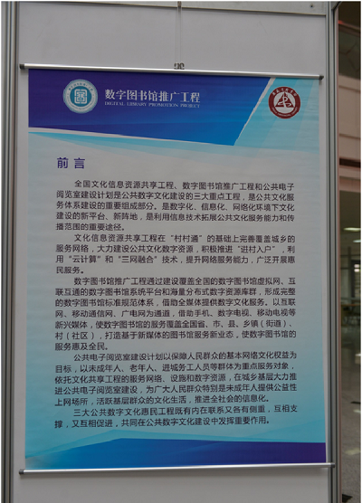 由国家图书馆、安徽省文化厅主办、安徽省图书馆承办的“全国三大公共数字文化工程”安徽地区建设成果相关图片于2016年5月9日-6月12日在合肥市图书馆一楼大厅展出。