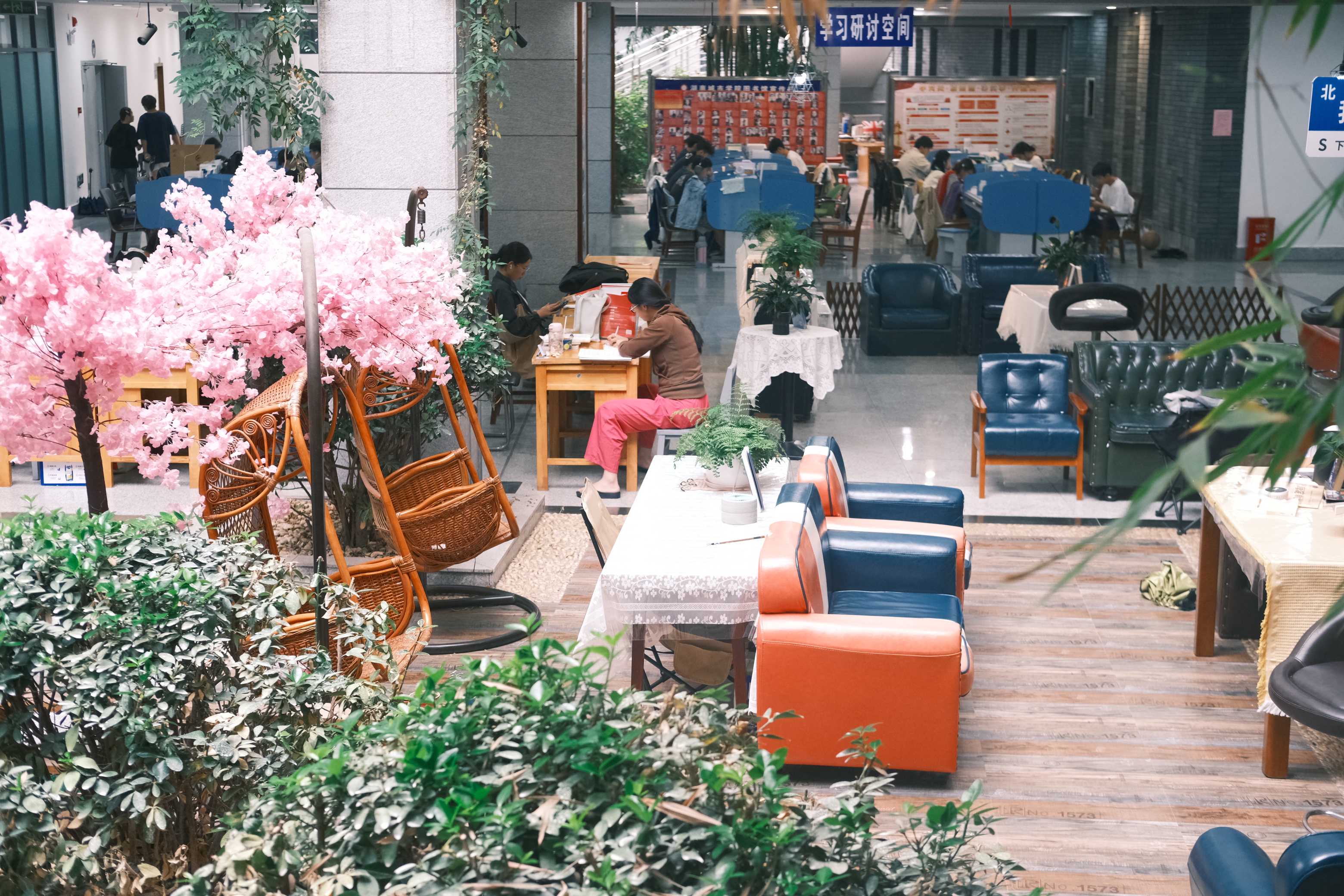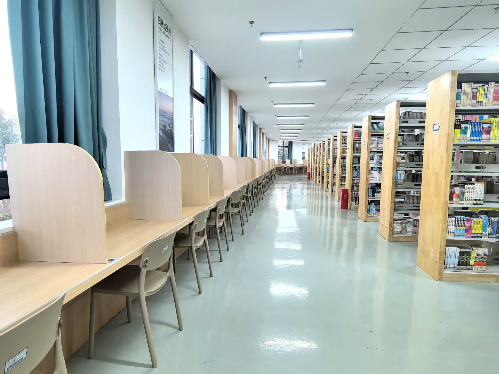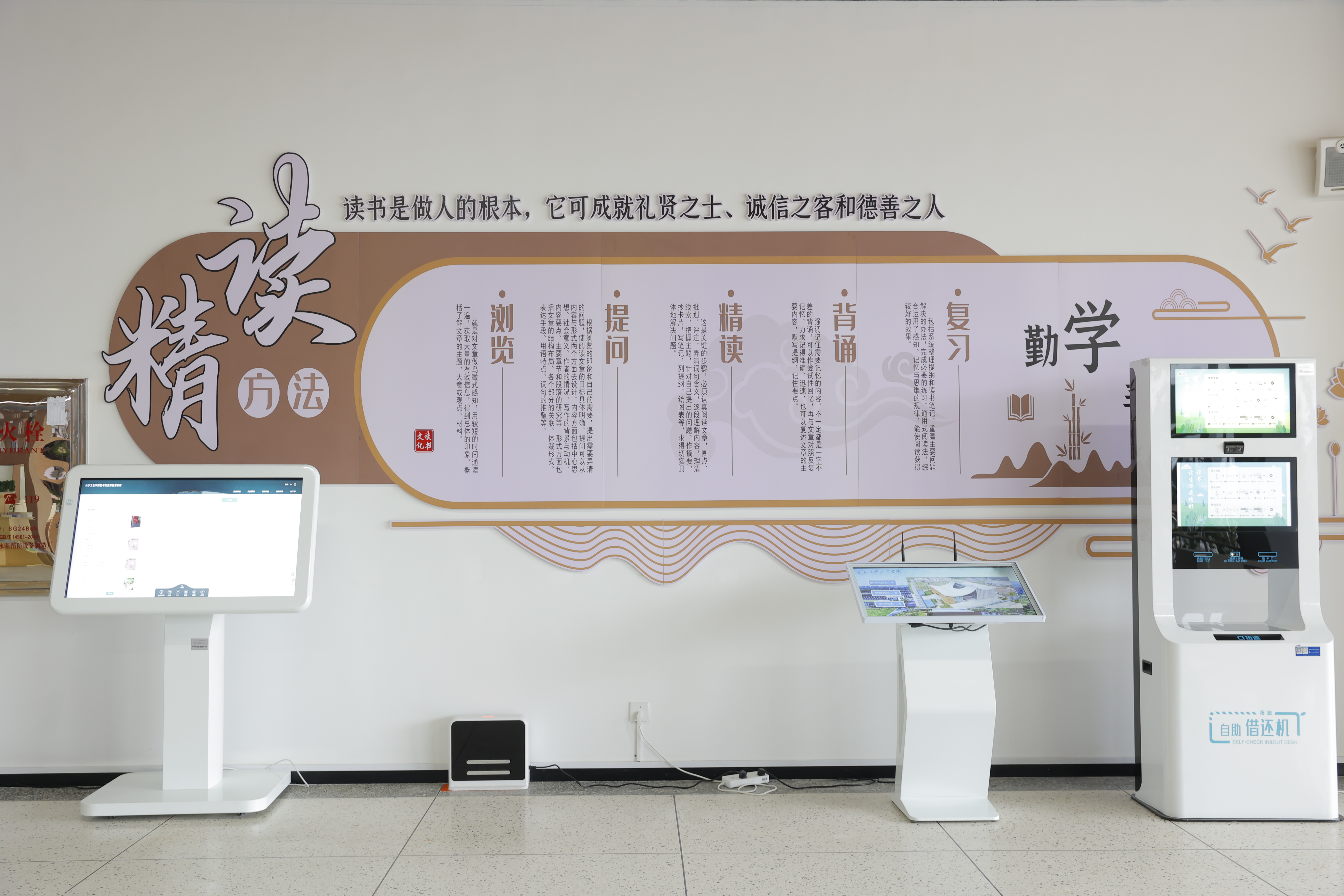为应对新时代高校图书馆向智慧化、复合型、开放型转型的需求,西校区图书馆于2024年8月完成了空间重构与服务升级项目。项目以“满足师生学术研究、学习提升及文化需求”为核心目标,通过整合人文资源与科技手段,打造了兼具知识传播、学术交流、文化传承与休闲体验的新型校园空间。图书馆引入了自助借还机、检索机、超星瀑布流电子图书借阅机、AI馆员、书法机、朗读亭等智能化设备,设置了可视化大数据智慧屏,实现了智能化管理。空间布局上除了设有8个藏书阅览室,还增设了红色书屋、科技馆、新书阅览室、研讨间、考研自修室等功能区,可充分满足师生多样化的学习、教学与科研需求。